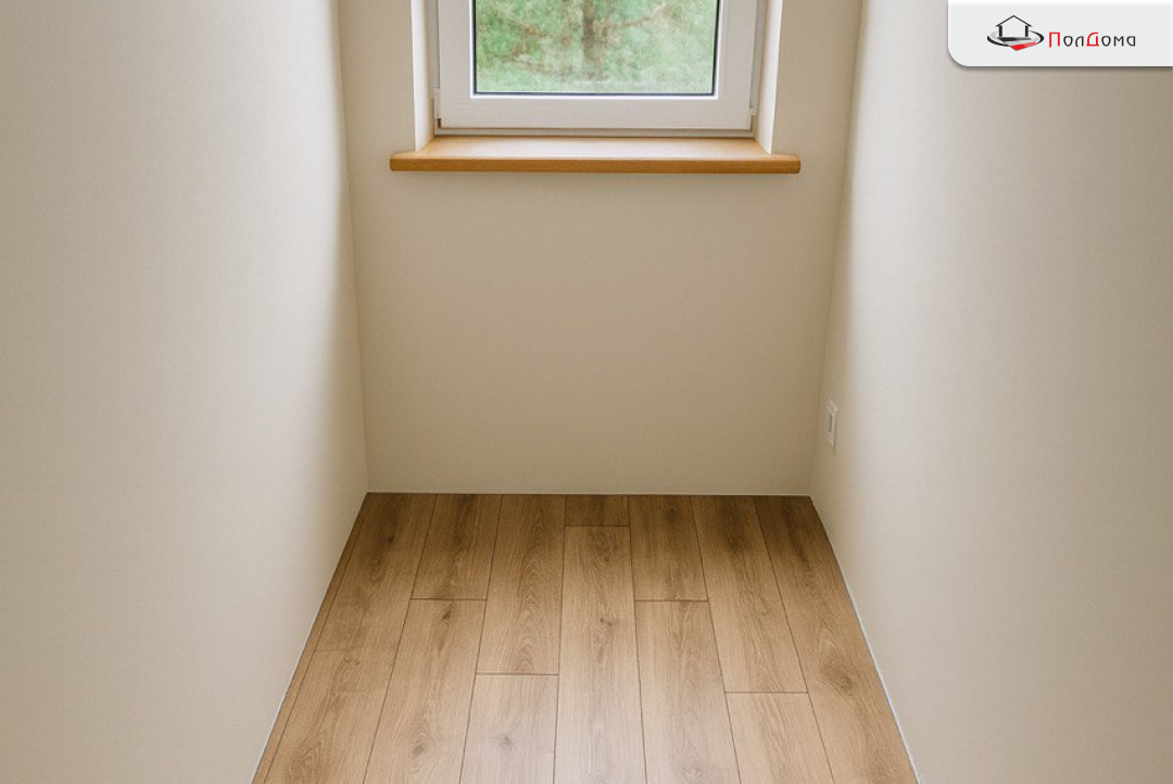 Дом получил современный, тёплый и износостойкий пол под натуральный дуб. Покрытие визуально объединяет помещения, легко моется и готово к ежедневной эксплуатации семьи и гостей.